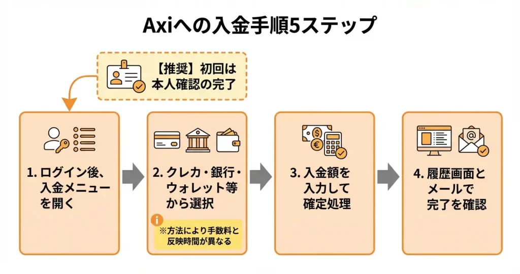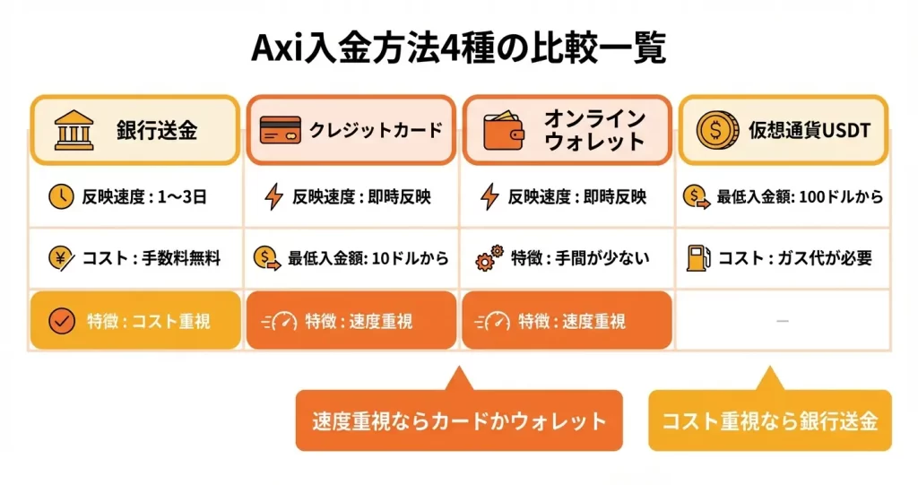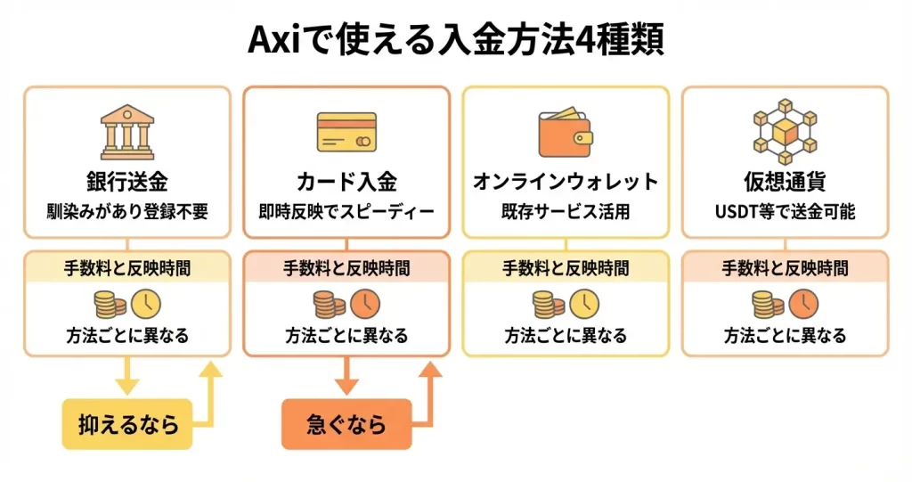 Axiへの入金方法は複数用意されており、それぞれ手数料や反映時間が異なります。利用できる入金方法の全体像と、各手段のコスト・スピードを把握しておくことで、自分の状況に最適な選択ができます。