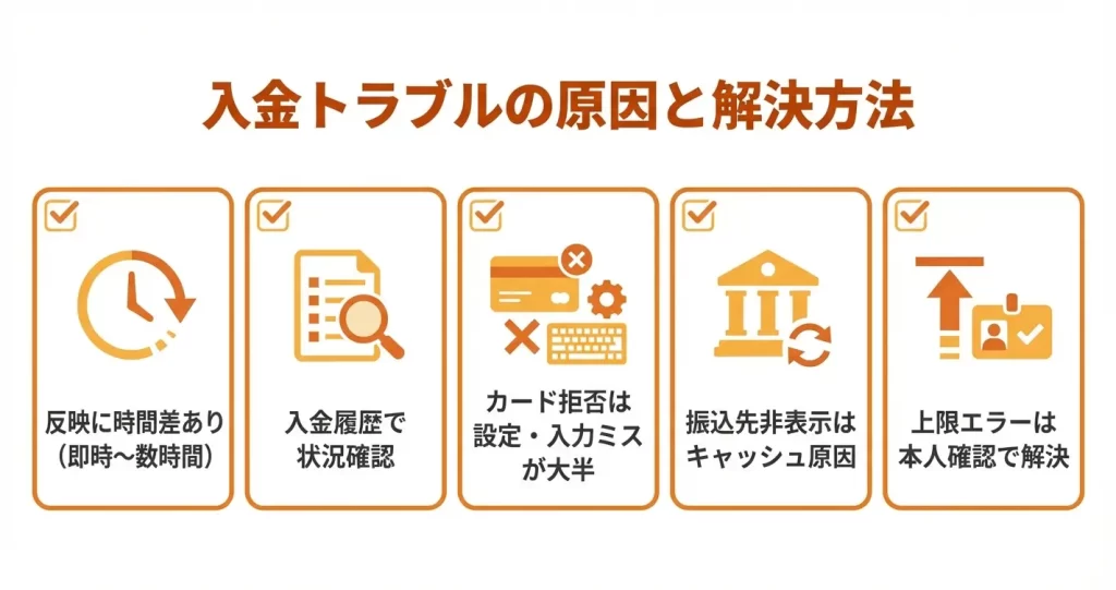 入金時のトラブルの多くは、確認と再試行で解決できます。焦らず一つずつ対処していきましょう