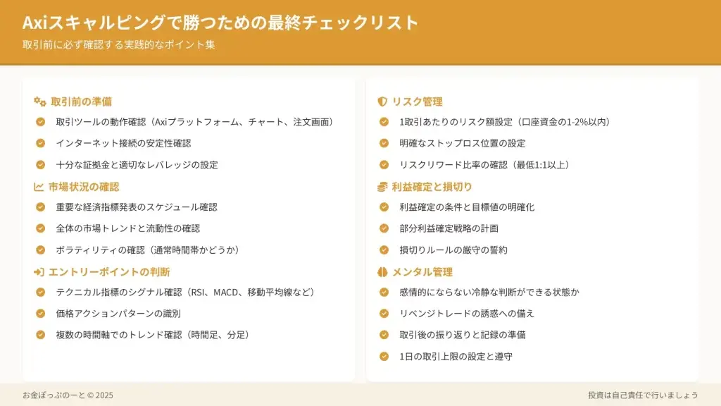 まとめ:Axiスキャルピングで勝つための最終チェックリスト