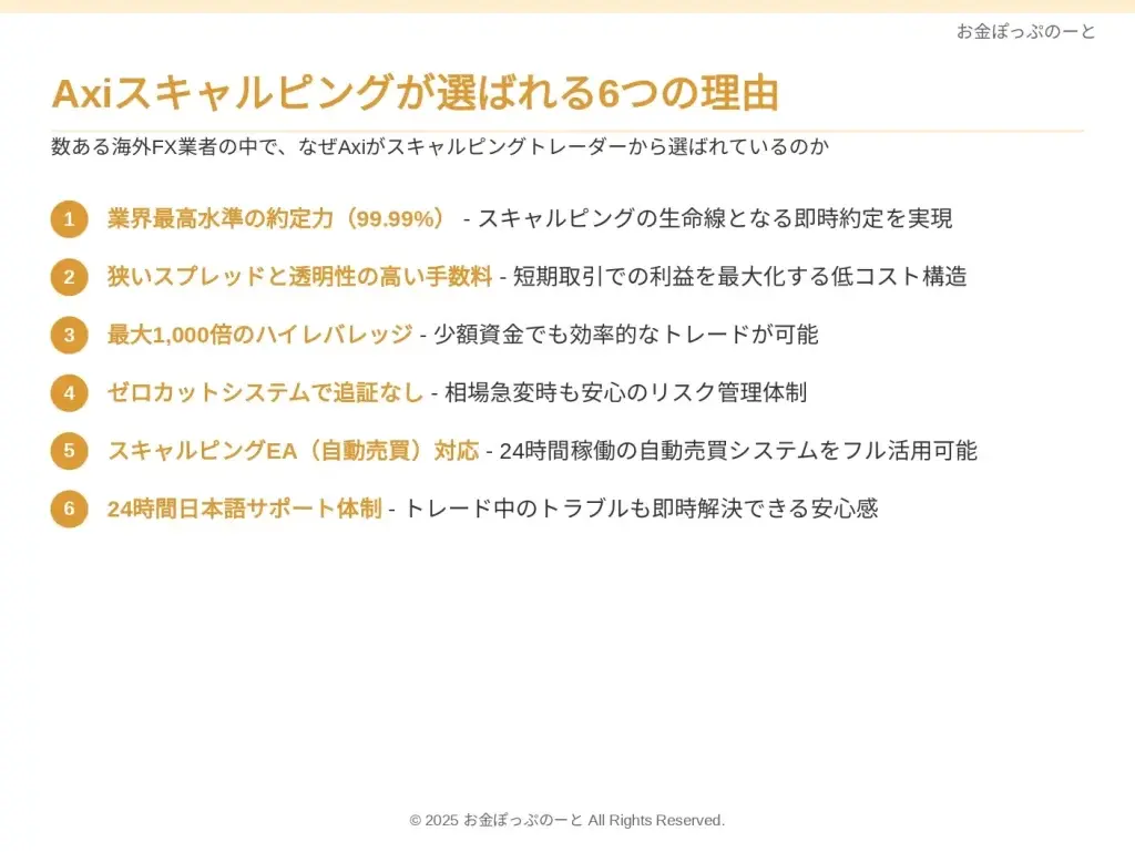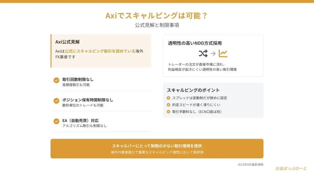 これは、XMなど一部の海外FX業者がスキャルピングに制限を設けているのとは対照的で、Axiの大きな強みとなっています。