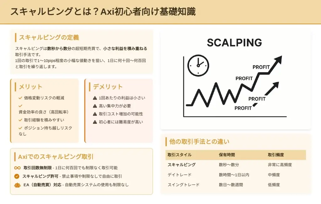 この章では、スキャルピングの基本概念から、他の取引手法との違い、そしてメリット・デメリットまで、Axiでスキャルピングを始める前に知っておくべき基礎知識を徹底解説します。