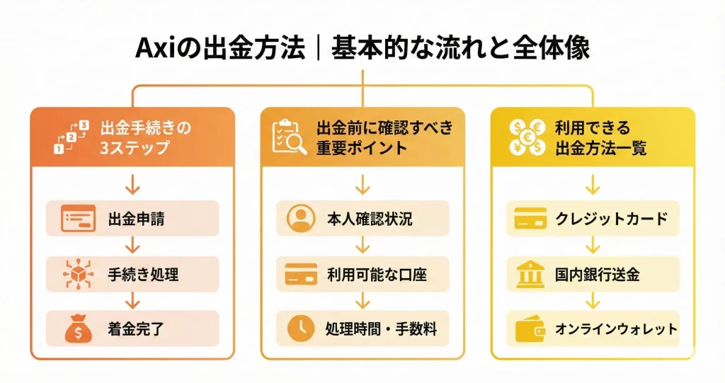 Axiで利用可能な主な出金方法には、国内銀行送金・クレジットカード返金・bitwallet・STICPAYなどがあり、それぞれ処理時間と手数料が異なります。