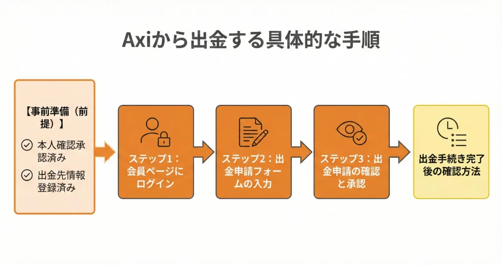 Axiの出金は、本人確認の完了状況と出金方法の登録が済んでいれば、3つのステップで完了します。