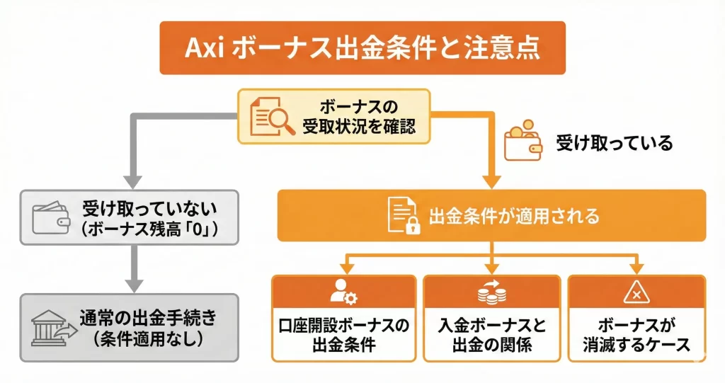 Axiではボーナスを受け取っている場合、出金に関して一定の条件が適用されます。条件を満たさずに出金申請を行うと、ボーナスが消滅したり出金が拒否される可能性があるため、事前にルールを正しく理解しておくことが重要です。