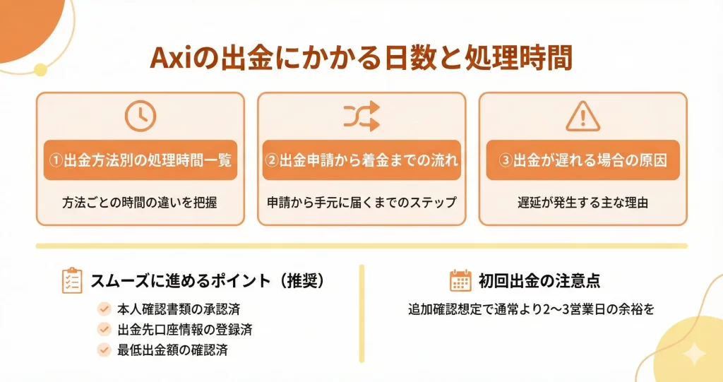 Axiでは出金方法ごとに処理時間が設定されており、選択する方法によって着金までの期間が大きく変わります。