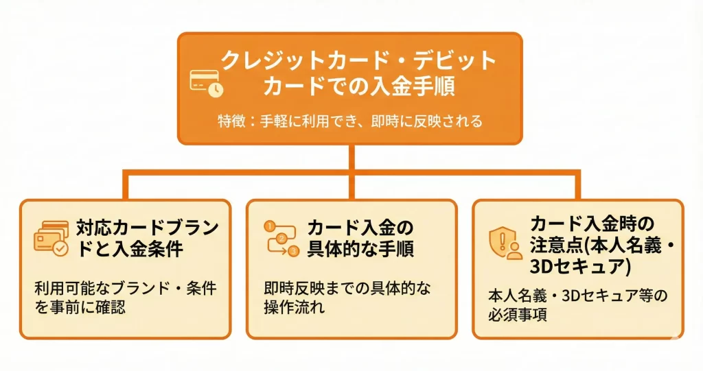 クレジットカード・デビットカードはVISAやMastercardブランドのカードを使った入金方法で、即時反映が特徴です。