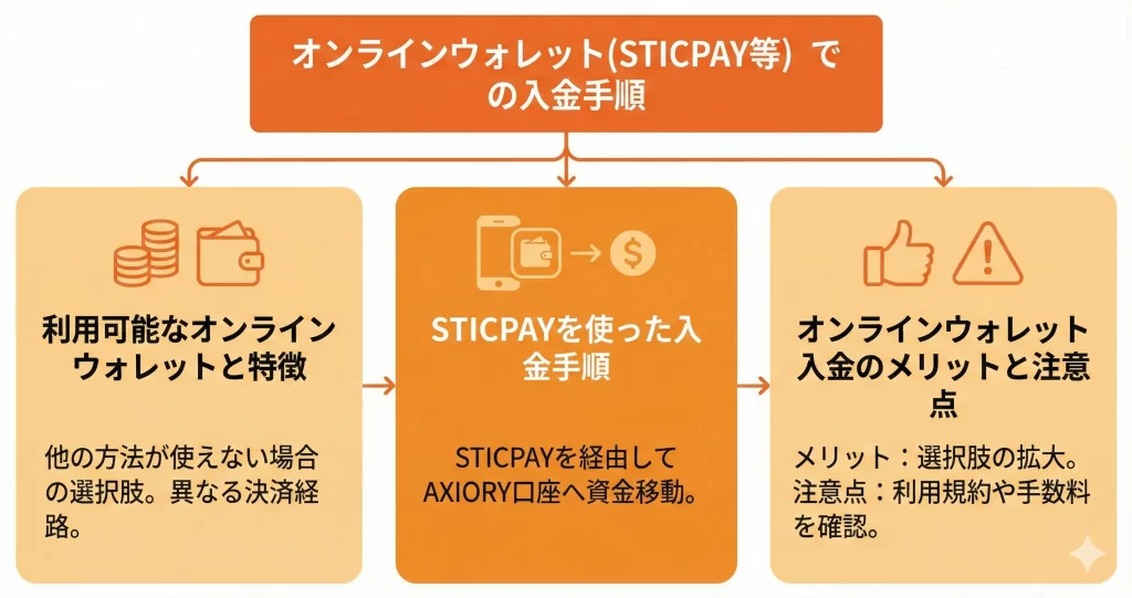 既にSticpayなどのオンラインウォレットを他の海外FX業者や決済で利用している場合は、同じウォレットをAXIORYでも使うことで資金管理が一元化できます。