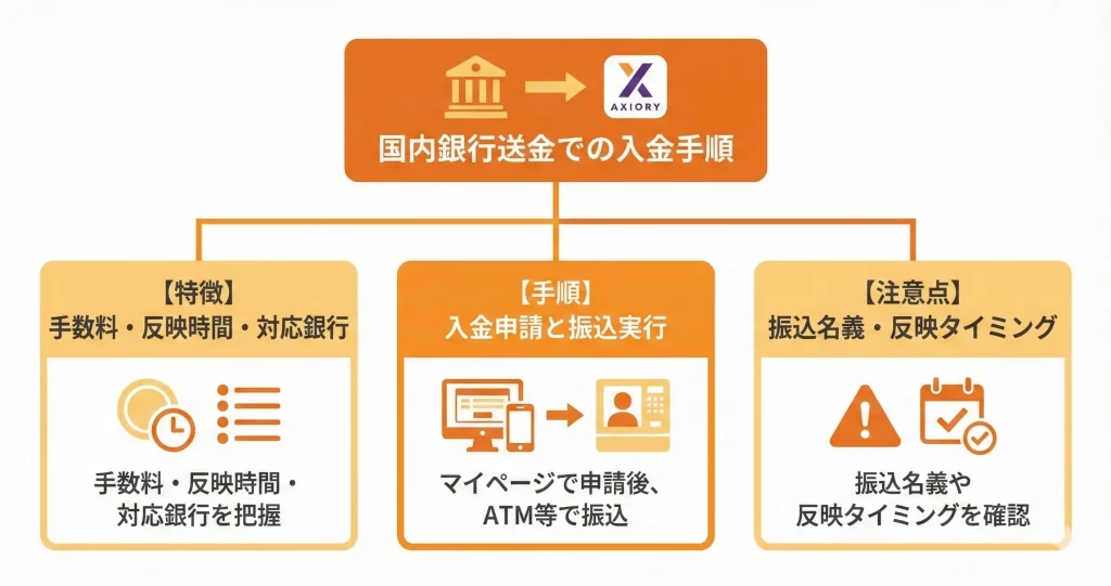 国内銀行送金は、日本国内の銀行口座から直接AXIORYの指定口座へ振込を行う入金方法です。