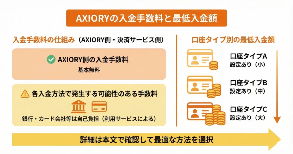 AXIORYでは複数の入金方法が用意されており、それぞれ手数料や反映時間、最低入金額が異なります。