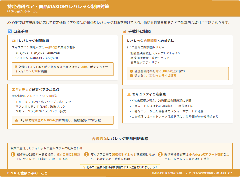 - 制限理由の特定:MyAxioryにログインし「アカウント情報」で証拠金残高と適用レバレッジを確認。