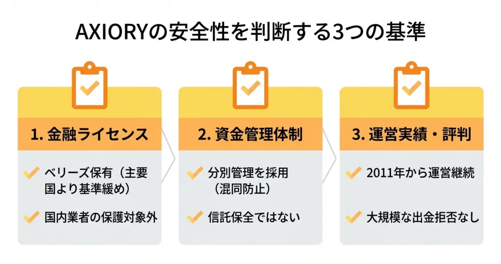 このセクションでは、AXIORYが「やばい」「危険」といった評判に該当するのか、公開されている情報をもとに検証します。安全性を判断する上で特に重要な3つの観点から、運営体制の実態を確認していきましょう。