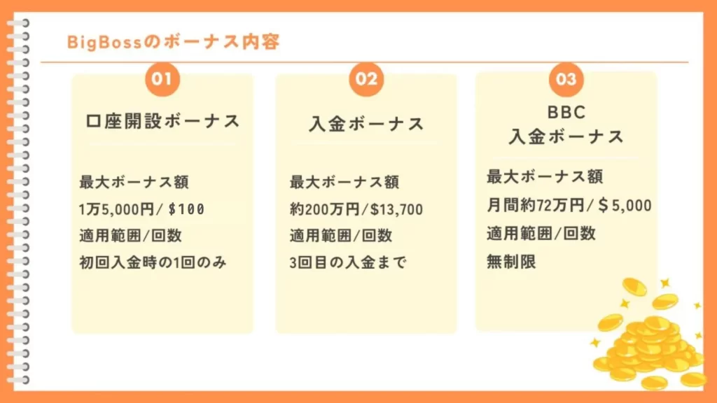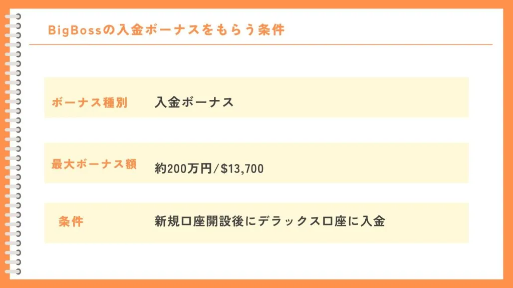 ここでは、BigBossの口座開設ボーナスを詳しく解説します。