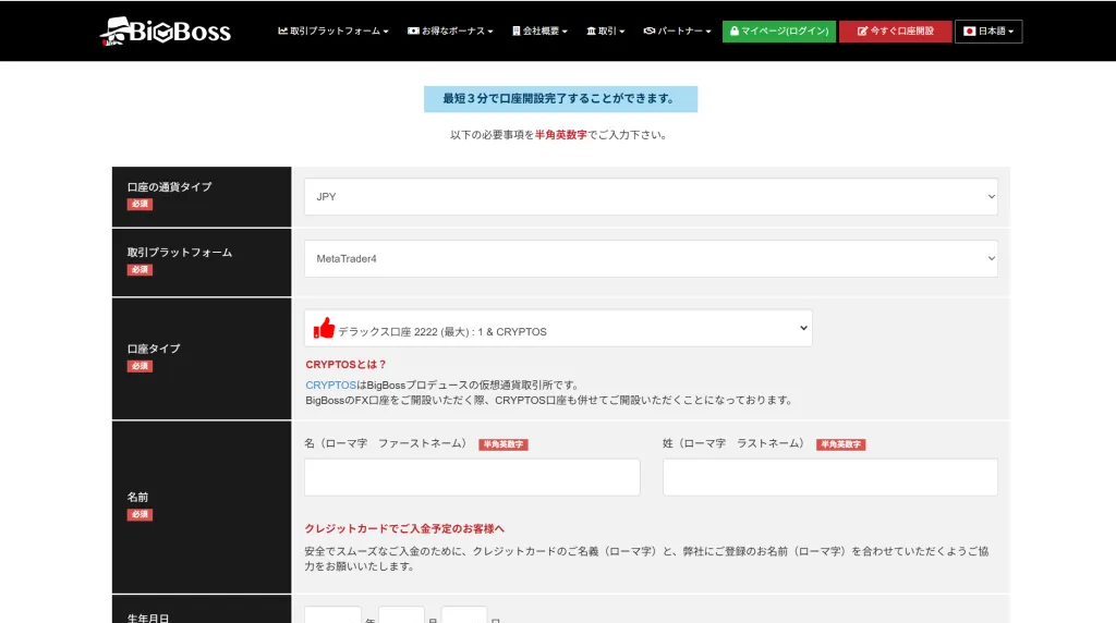 BigBossの公式ホームページに「いますぐ口座開設」を押して必要事項を入力し、リボーナス対象のリアル口座を開設します。