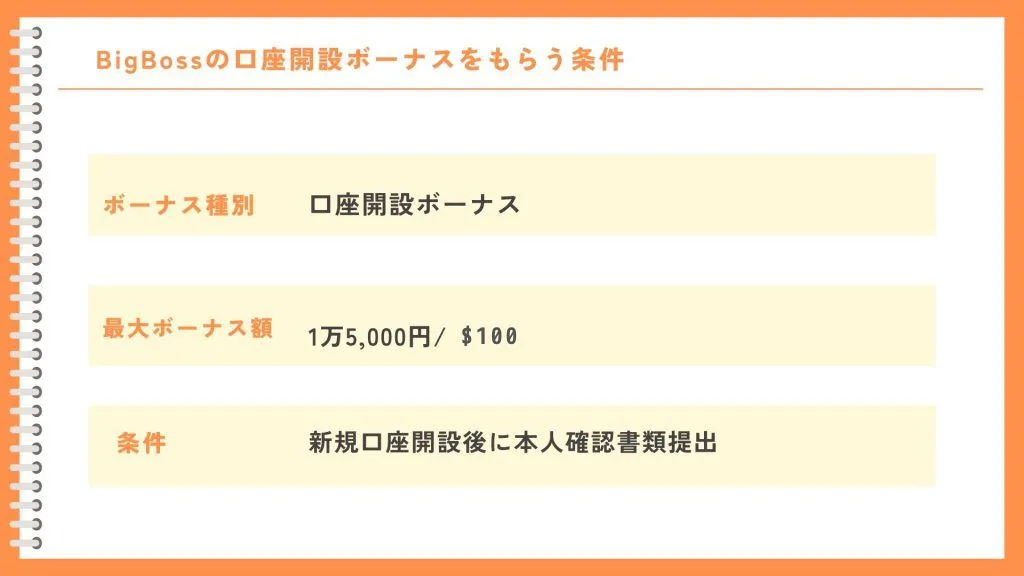 あります。BigBossでは新規口座開設と本人確認完了で、最大15,000円(または$100)の口座開設ボーナスが受け取れます。