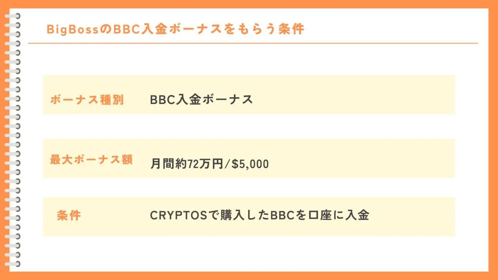さらに、BigBoss独自の仮想通貨現物取引所「CRYPTOS」にBBC(BigBossコイン)で入金すると、追加で10%の入金ボーナスが受け取れるBBC入金ボーナスもあります。