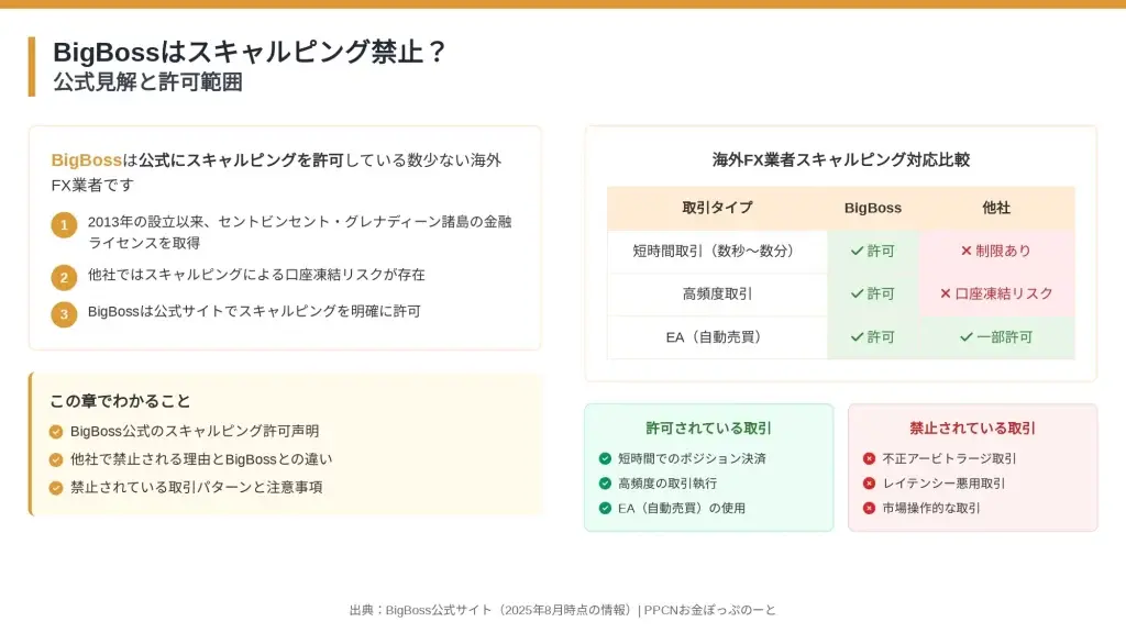 本記事では、BigBossの公式スキャルピング許可方針から、プロスプレッド口座の超低コスト環境、他社との詳細比較まで、実践に必要な情報を網羅的に解説します。