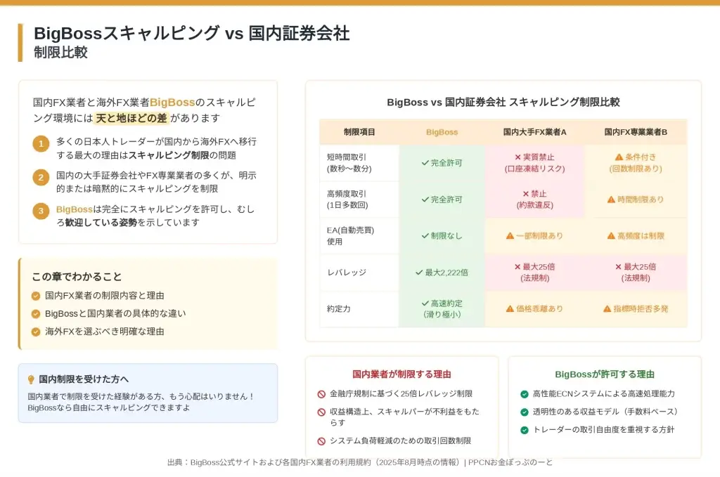 BigBossのスキャルピング環境を、規制された主要海外FX業者と比較すると、その位置づけがより明確になります。