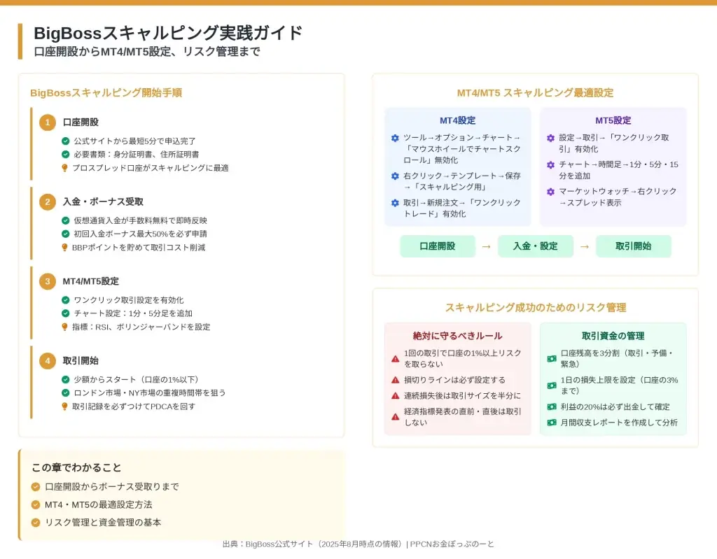 この記事を読めば、BigBossがスキャルピングに適した業者かを客観的に判断でき、最適な口座タイプの選択から具体的な取引戦略まで、安心してスキャルピングを開始できるようになります。
