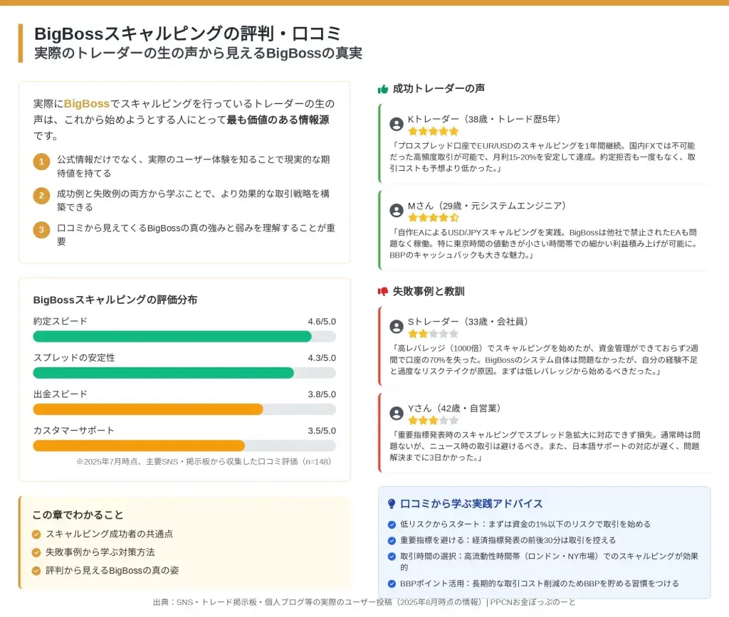 さらに通貨ペア別の効果的な利確設定や、MT4の最適化設定、実際のユーザー体験談も含めて、BigBossでのスキャルピング環境を多角的に検証します。