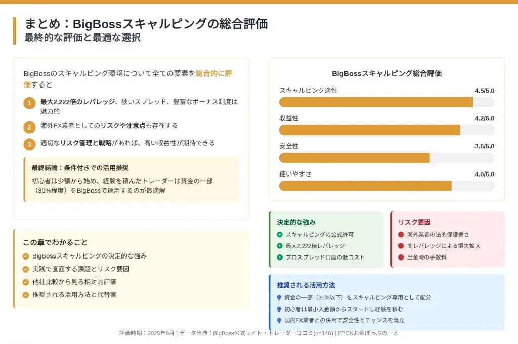 BigBossでのスキャルピング取引について、本記事で詳細に検証してきた全ての要素を総合的に評価します。