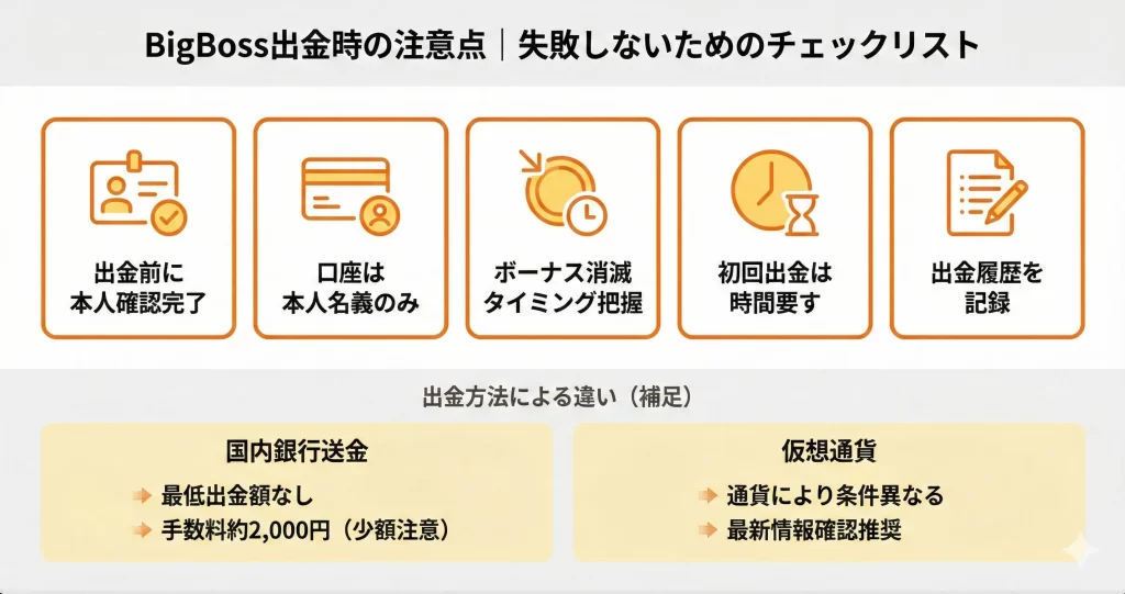 BigBossでは出金方法ごとに手数料体系が異なるため、利用頻度と金額に応じて最も負担の少ない方法を選択することが重要です。