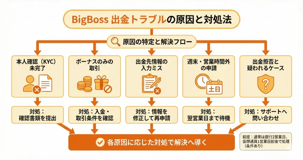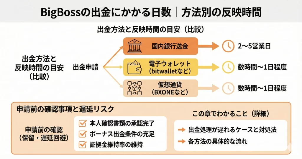 営業日はBigBoss側の基準(平日のみ、土日祝は非営業日)で計算されるため、週末や日本の祝日をまたぐ場合は着金が遅れることがあります。