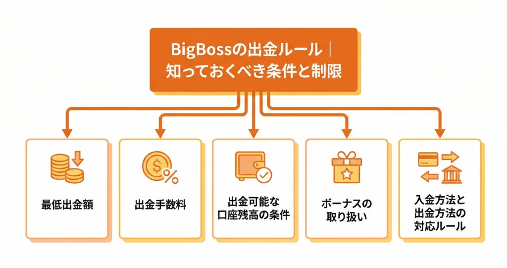BigBossから出金する際には、最低出金額や手数料、入出金方法の対応関係など、いくつかの制約とルールが設けられています。