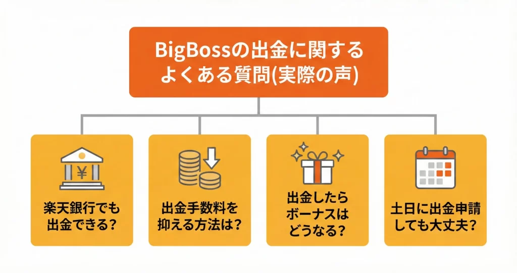 BigBossの出金を初めて行う際には、手順以外にも「自分の銀行口座でも大丈夫か」「手数料を安くできないか」といった実務的な疑問が生じます。