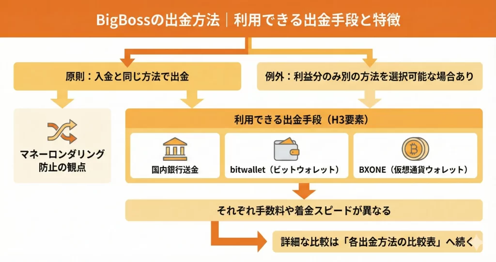 BigBossでは2026年時点で複数の出金方法が用意されており、それぞれ手数料や着金スピードが異なります