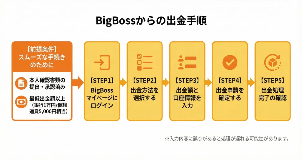 BigBossからの出金は、マイページ上で完結する手続きです。ログインから申請完了まで5つのステップに分かれており、各画面で必要な情報を入力していく流れになります。