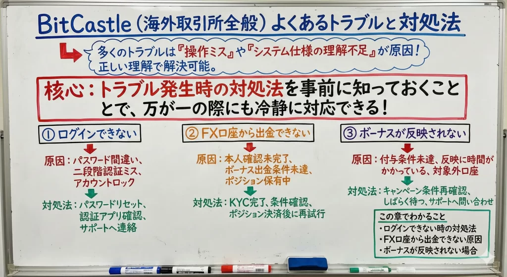 これらのトラブルは海外取引所全般で報告される典型的なものであり、BitCastleに限った問題ではありません。多くのトラブルは操作手順やシステムの仕様を正しく理解することで解決可能です。