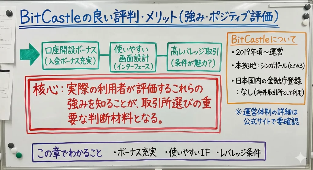 ここでは、口コミやサービス内容から確認できるBitCastleの強みや、ポジティブな評価を集めている特徴について整理します。取引所選びの判断材料として、メリット面を把握しておきましょう。
