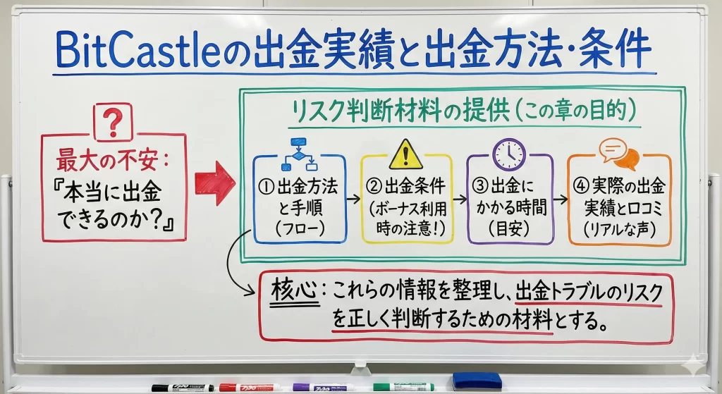 ここまでBitCastleのデメリットや注意すべき評判を確認しました。次のセクションでは、BitCastleの出金実績や出金方法・条件について整理し、総合的な判断材料を提供します。