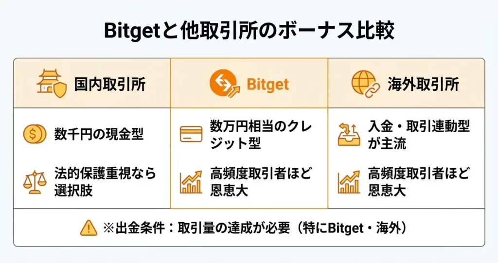 国内取引所と海外取引所それぞれの特典内容を比較し、Bitgetを選ぶべき場面とそうでない場面を整理します。ここでは客観的な比較軸をもとに、各取引所の特徴を明らかにします。