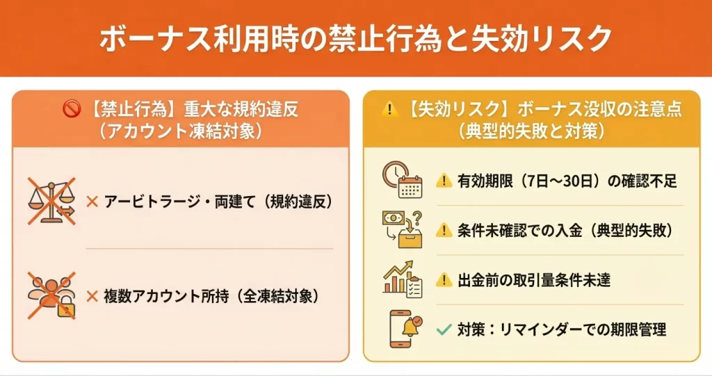 ボーナスを確実に受け取り、有効に活用するためには、禁止行為や期限管理など、事前に押さえるべき注意点が存在します。ここでは、ボーナス利用時に起こりやすいトラブルと、それを回避するための具体的な対策を解説します。