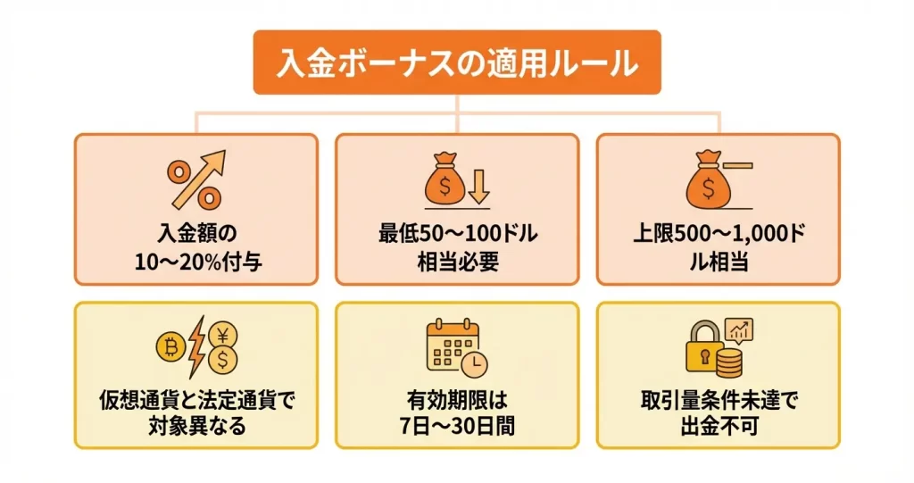 ここでは入金ボーナスの具体的な仕組みと、適用される条件を順に整理します。