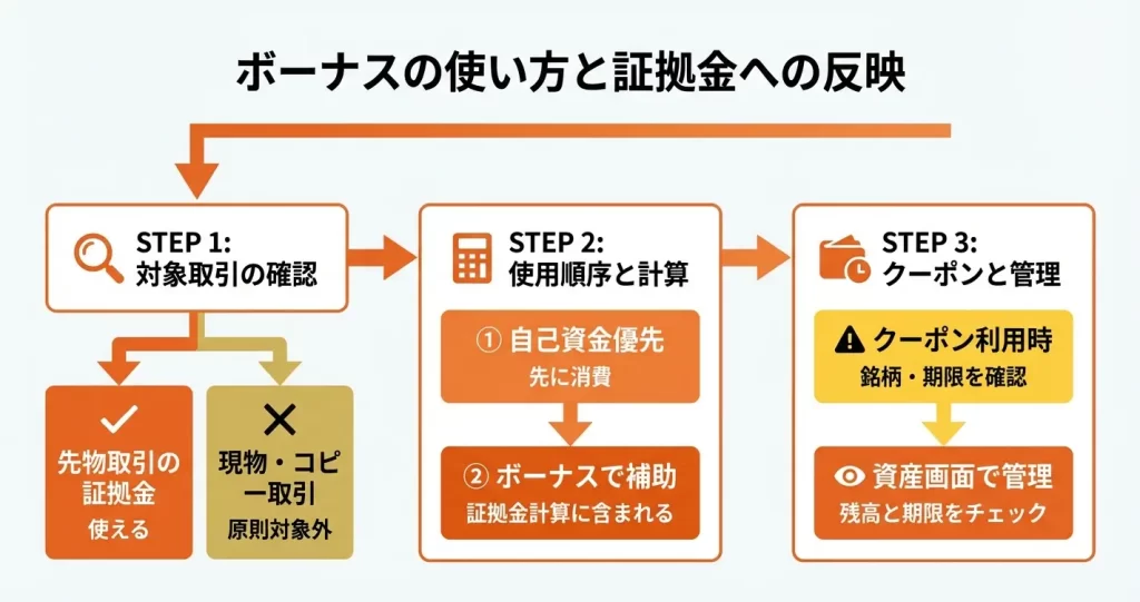 このセクションでは、ボーナスが使える取引の種類と実際の活用手順、証拠金としてどう反映されるかの仕組みを解説します。ボーナスを正しく活用することで、自己資金を抑えながら取引の選択肢を広げることが可能になります。