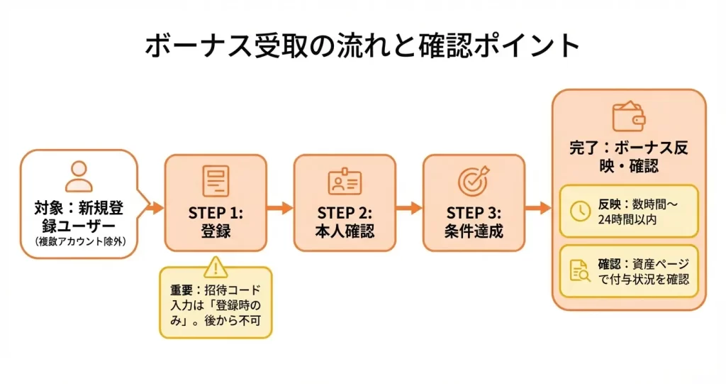 このセクションでは、対象となる条件、具体的な登録の流れ、招待コードの入力タイミング、ボーナス反映までの確認方法を順に解説します。手順を正確に踏むことで、ボーナスの取りこぼしを防ぐことができます。