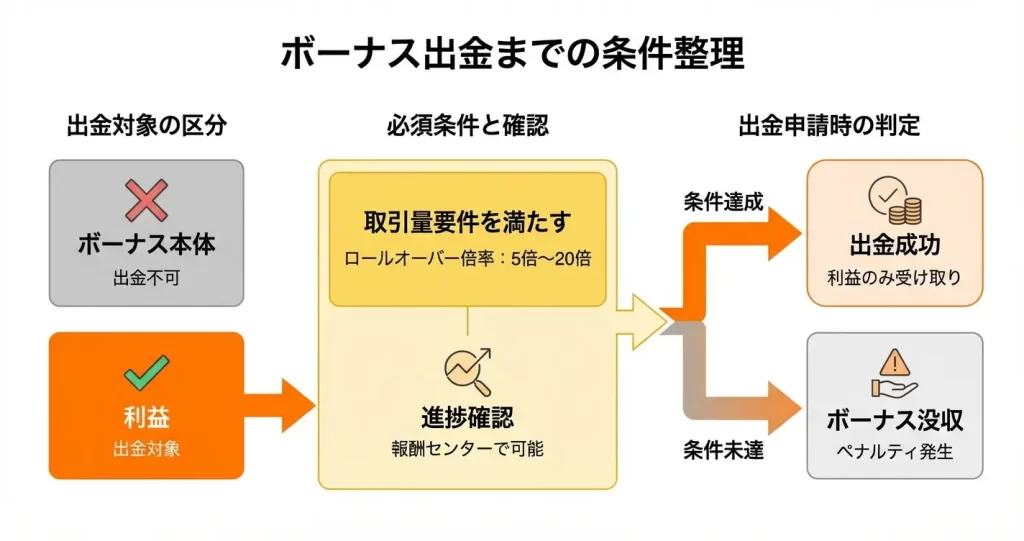 入金額の5〜10倍程度の取引高達成などの条件が設定され、条件未達成の状態で出金申請を行うとボーナスが没収される点に注意が必要です。