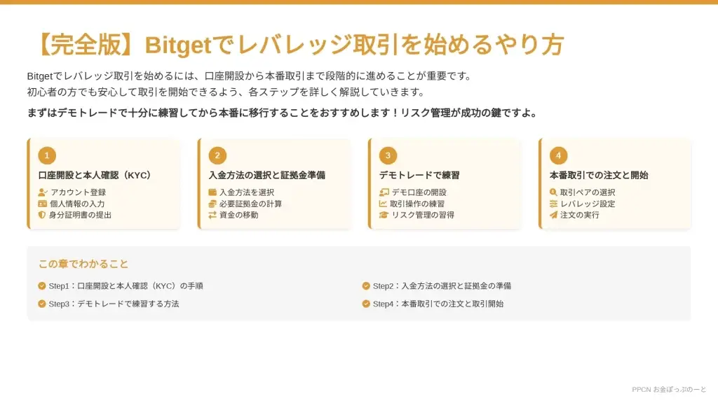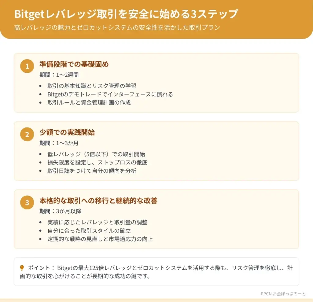 最後に、これまでの内容を踏まえて、実際にBitgetでレバレッジ取引を安全に始めるための具体的な3つのステップをまとめます。
