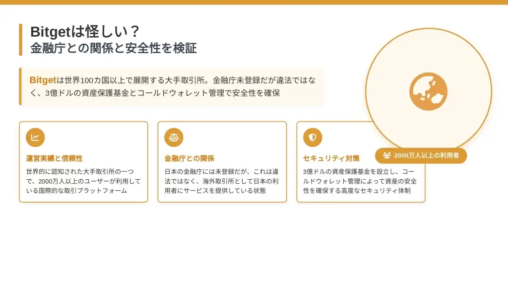Bitgetは2018年にシンガポールで設立された海外の仮想通貨取引所で、2024年現在、世界100カ国以上で2,500万人以上のユーザーを抱え、世界最大級の仮想通貨取引所としての地位を確立しています。