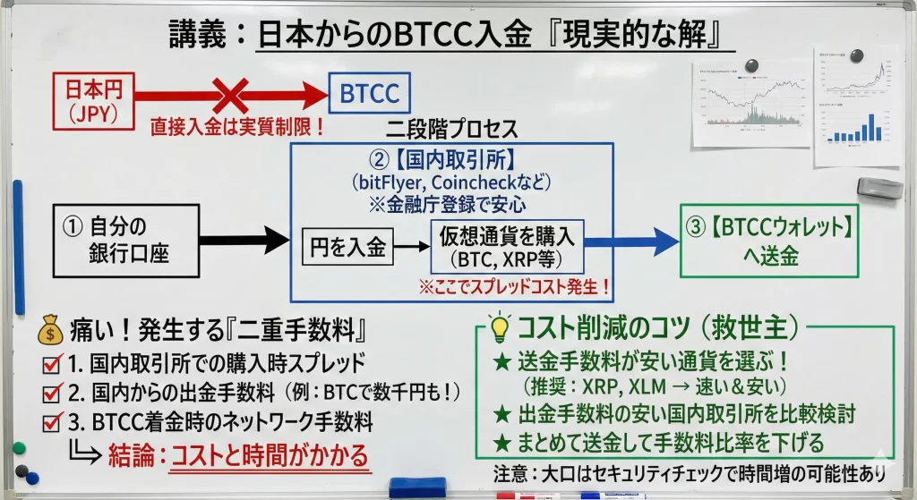 BTCCでは主に仮想通貨による入金が中心となっており、日本円での直接入金には対応していません。