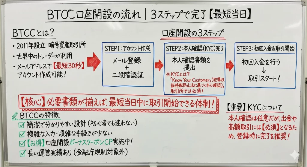 BTCCの利用を決めた方は、以下の手順で口座開設を進めましょう。