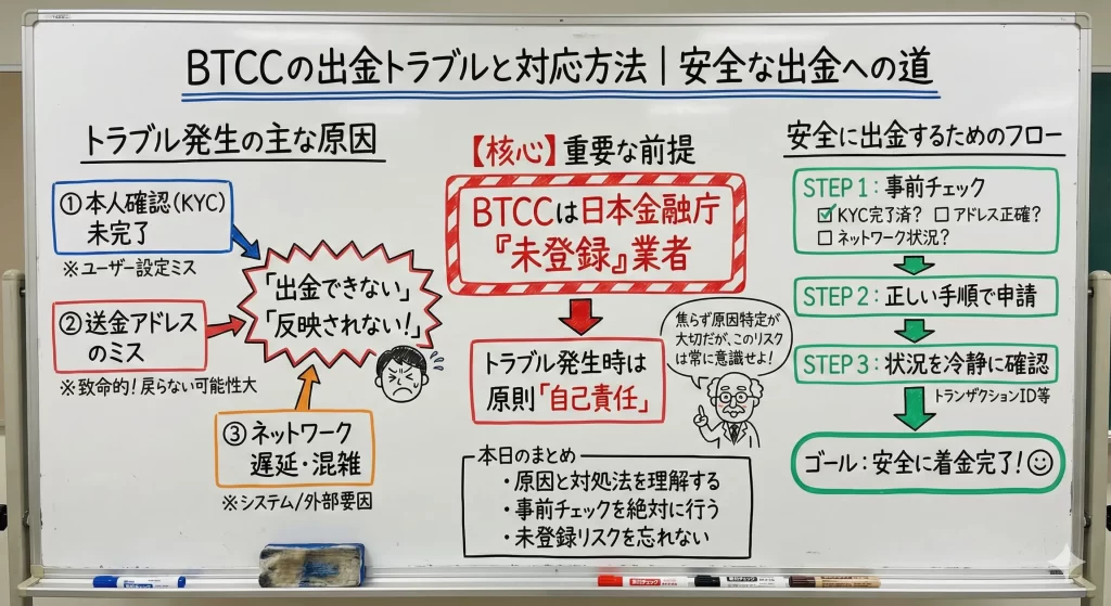 さらに、万が一のトラブルにも慌てず対処できる知識が身につき、安心してBTCCでの取引を始められるようになります。