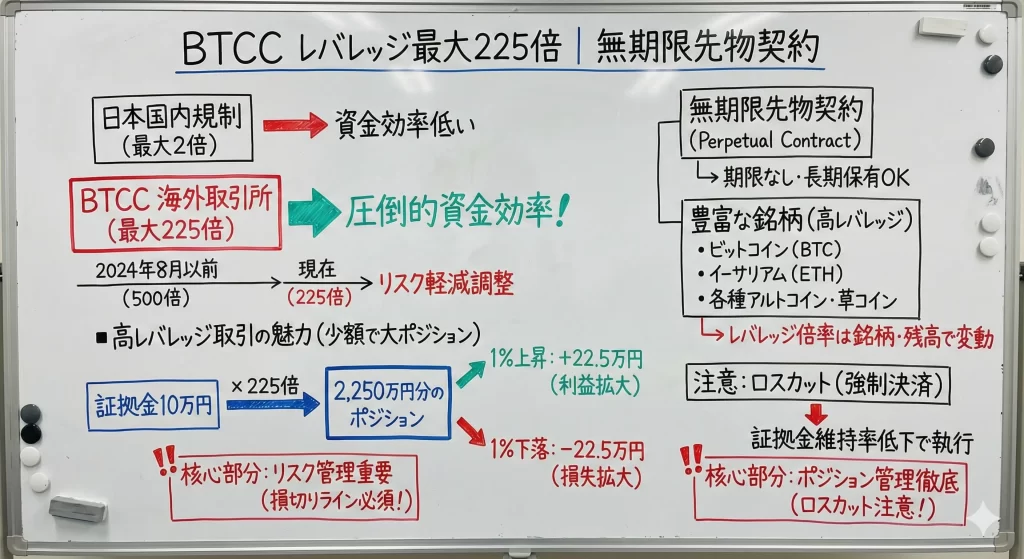 BTCCの最大225倍というレバレッジは魅力的である一方、初心者にとっては大きなリスクともなります。