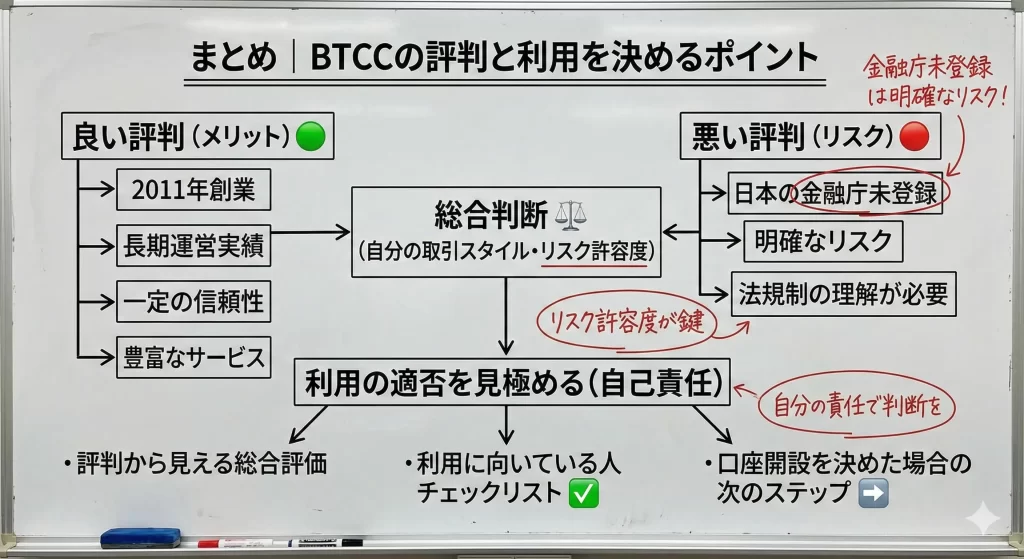 まとめ|BTCCの評判と利用を決めるポイント
