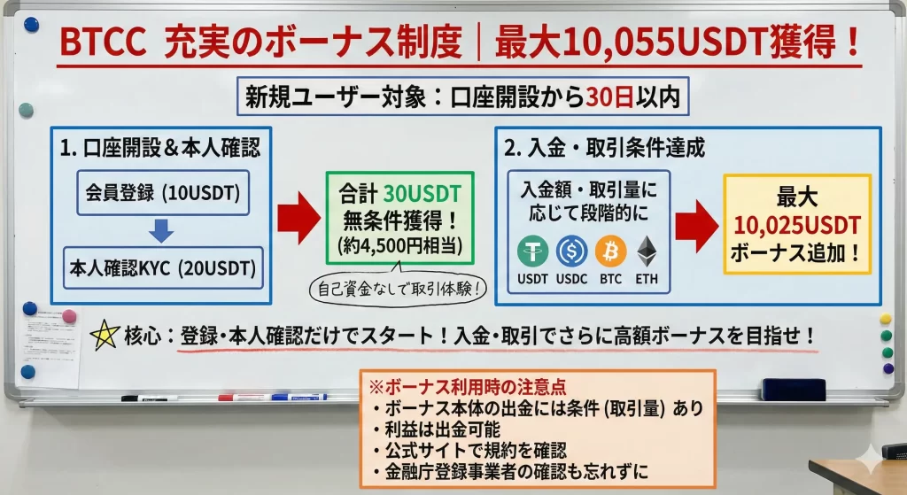 BTCCでは新規登録ボーナスや入金ボーナス、取引手数料のリベートなど、様々なキャンペーンが定期的に開催されています。