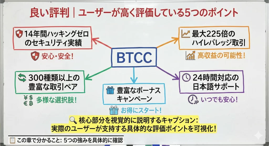 BTCCに関する肯定的な口コミの中で特に多く見られる評価ポイントを5つに整理しました。