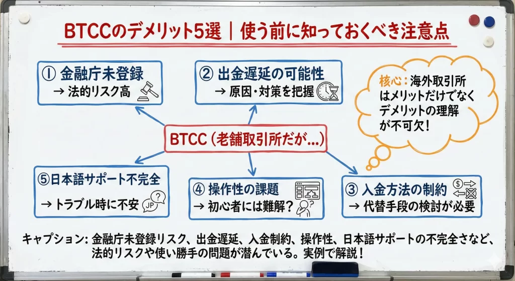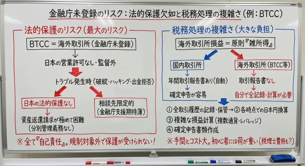 BTCCに関する否定的な口コミで最も多く見られるのが、「日本の金融庁に登録されていない」という点です。