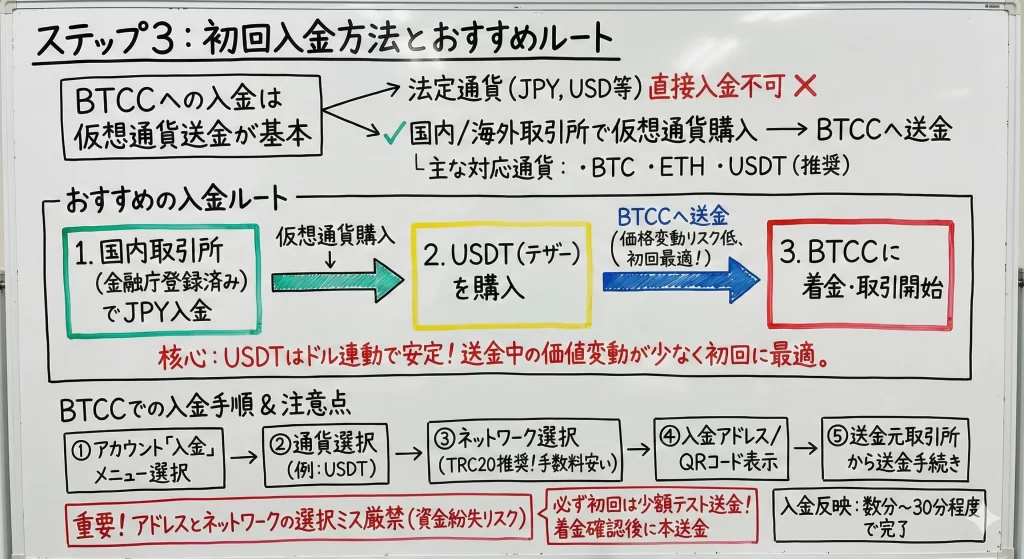 BTCCでは仮想通貨入金が基本となり、ビットコインやUSDTなどのステーブルコインでの入金が一般的です。